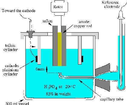 (\($\approx$\) 700 rotations/minute) in an 85% (by mass) solution of phosphoric acid maintained at 20°C by a heat bath (Fig. 1) the rotation speed must be low enough to avoid creating turbulence